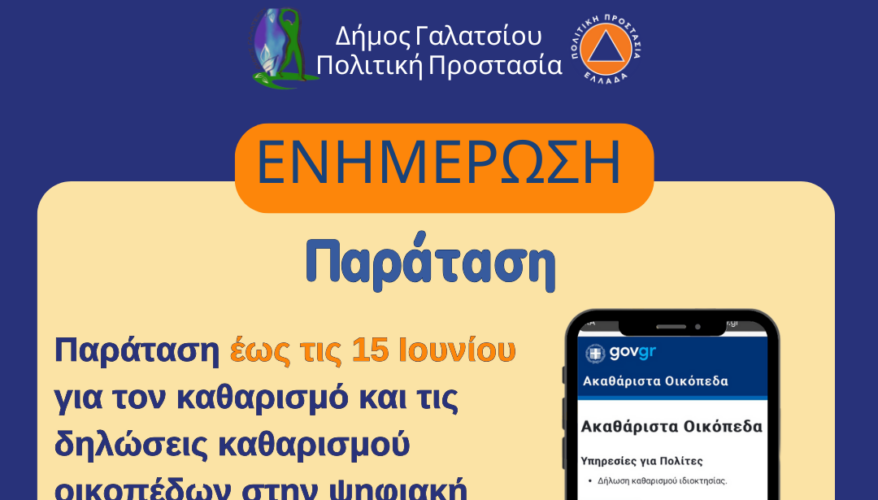 Με Απόφαση του Υπουργείου Κλιματικής Κρίσης και Πολιτικής Προστασίας (Β’ 2015/25 Απριλίου 2025) δίνεται παράταση έως τις 15 Ιουνίου στους πολίτες, προκειμένου να δηλώσουν τον καθαρισμό των οικοπεδικών και ακάλυπτων χώρων ιδιοκτησίας τους, στην πλατφόρμα του Εθνικού Μητρώου Τήρησης Μέτρων Προληπτικής Πυροπροστασίας, η οποία βρίσκεται στην ηλεκτρονική διεύθυνση akatharista.apps.gov.gr, καθώς και στον ιστότοπο του Υπουργείου Κλιματικής Κρίσης και Πολιτικής Προστασίας civilprotection.gov.gr.
