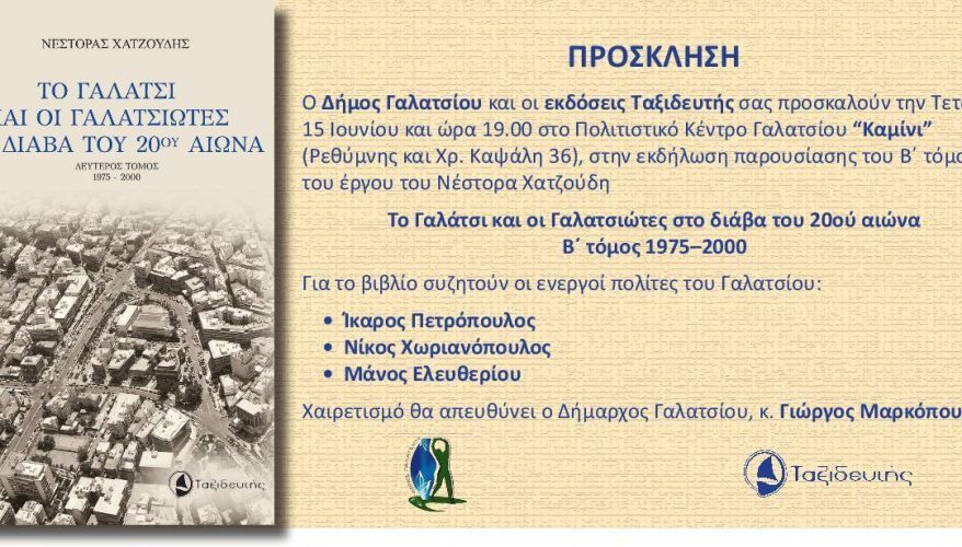 Την Τετάρτη 15 Ιουνίου η παρουσίαση του βιβλίου «Το Γαλάτσι και οι Γαλατσιώτες στο διάβα του 20ου αιώνα, Β’ Τόμος 1975-2000», στο Πολιτιστικό Κέντρο «Καμίνι»