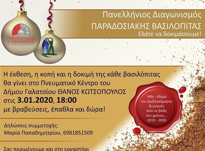 Ελάτε να δοκιμάσουμε στο Πνευματικό Κέντρο του Δήμου Γαλατσίου “Θάνος Κωτσόπουλος” σήμερα στις 18:00 με βραβεύσεις, έπαθλα και δώρα.