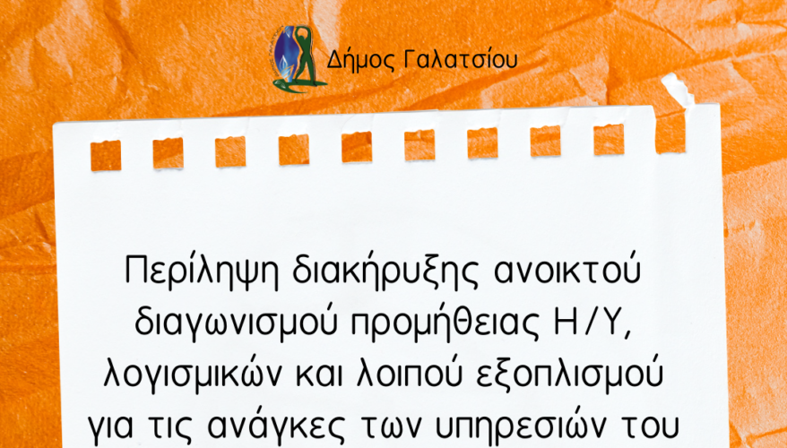 ΠΕΡΙΛΗΨΗ ΔΙΑΚΗΡΥΞΗΣ ΑΝΟΙΚΤΟΥ ΗΛΕΚΤΡΟΝΙΚΟΥ ΔΙΑΓΩΝΙΣΜΟΥ ΠΡΟΜΗΘΕΙΑΣ Η/Υ, ΛΟΓΙΣΜΙΚΟΥ ΚΑΙ ΛΟΙΠΟΥ ΕΞΟΠΛΙΣΜΟΥ ΓΙΑ ΤΙΣ ΑΝΑΓΚΕΣ ΤΩΝ ΥΠΗΡΕΣΙΩΝ ΤΟΥ ΔΗΜΟΥ ΓΑΛΑΤΣΙΟΥ ΣΥΝΟΛΙΚΟΥ ΕΝΔΕΙΚΤΙΚΟΥ ΠΡΟΥΠΟΛΟΓΙΣΜΟΥ (ΧΩΡΙΣ Φ.Π.Α.) 28.000,00 €