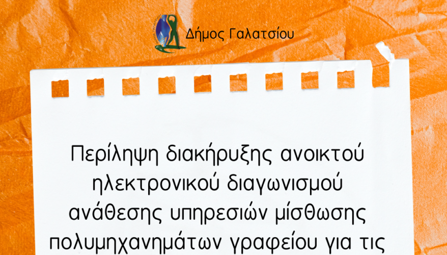 προκηρύσσει ανοικτό ηλεκτρονικό διαγωνισμό, κάτω των ορίων με σφραγισμένες προσφορές, σύμφωνα με τις διατάξεις του άρθρου 27 του Ν.4412/2026, όπως τροποποιήθηκε και ισχύει σήμερα και την αριθ 54/2025 απόφαση της Δημοτικής Επιτροπής του Δήμου (ΑΔΑ: ΨΛ3ΔΩ9Λ-ΛΛΛ) με κριτήριο το κόστος εκτύπωσης ανά σελίδα που δεν πρέπει να ξεπερνάει το ποσό των 0,008€, μη συμπεριλαμβανομένου ΦΠΑ 24%,σύμφωνα με τους όρους της διακήρυξης και της από 03.12.2024 Μελέτης της Διεύθυνσης Προγραμματισμού, Οργάνωσης, Ποιότητας, Ανάπτυξης, Τεχνολογιών Πληροφορικής και Επικοινωνιών (Τμήμα Τεχνολογιών Πληροφορικής και Επικοινωνιών) του Δήμου, για την ανάθεση υπηρεσιών μίσθωσης πολυμηχανημάτων γραφείου για τις ανάγκες των σχολικών μονάδων του Δήμου Γαλατσίου, συνολικού ενδεικτικού προϋπολογισμού ποσού 47.616,00 € (μη συμπεριλαμβανομένου του αναλογούντος Φ.Π.Α.).