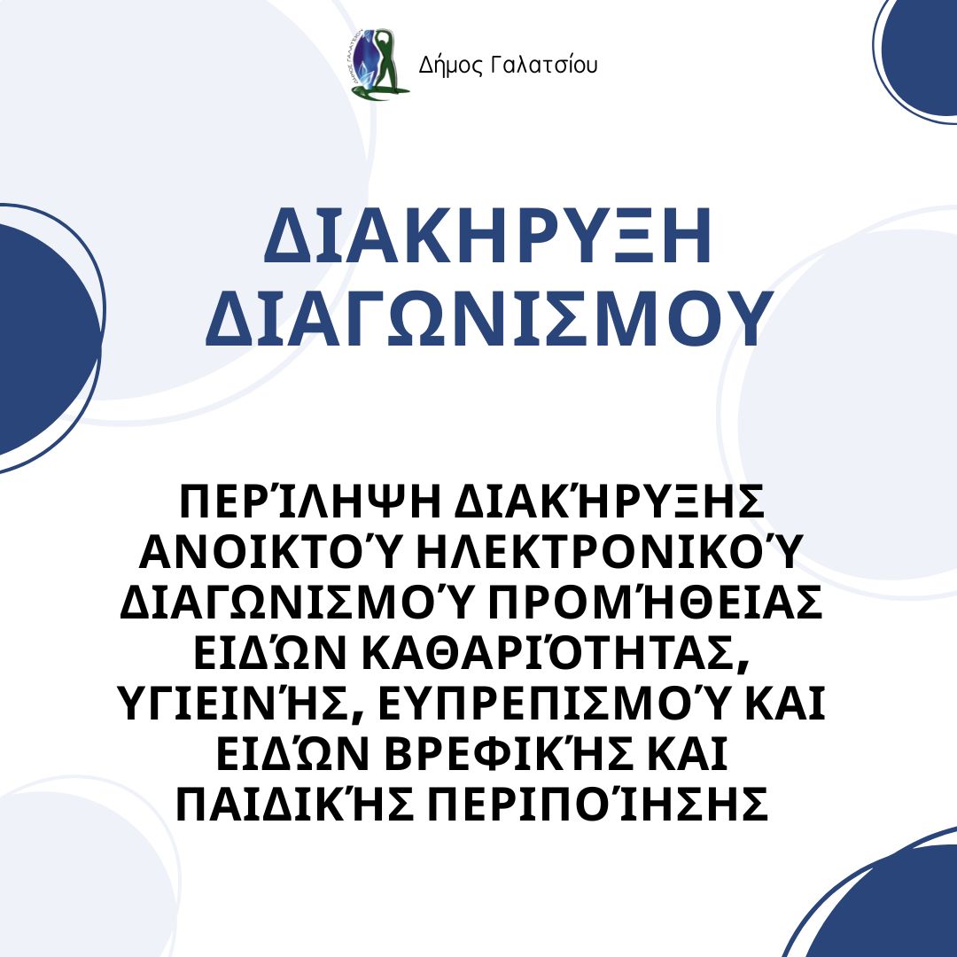 ΠΕΡΙΛΗΨΗ ΔΙΑΚΗΡΥΞΗΣ ΑΝΟΙΚΤΟΥ ΗΛΕΚΤΡΟΝΙΚΟΥ ΔΙΑΓΩΝΙΣΜΟΥ προμήθειας ειδών καθαριότητας , υγιεινής , ευπρεπισμού & ειδών βρεφικής & παιδικής περιποίησης τα οποία θα χρησιμοποιηθούν για την κάλυψη αναγκών της Διεύθυνσης Κοινωνικής Πολιτικής & Υγείας, του Τμήματος Διαχείρισης Οργάνωσης Άλσους Βεΐκου της Διεύθυνσης Πολιτισμού & Αθλητισμού, των σχολικών μονάδων και των παιδικών / βρεφονηπιακών σταθμών & παραρτημάτων των Κ.Α.Π.Η. Δήμου Γαλατσίου ΣΥΝΟΛΙΚΟΥ ΕΝΔΕΙΚΤΙΚΟΥ ΠΡΟΥΠΟΛΟΓΙΣΜΟΥ (ΧΩΡΙΣ Φ.Π.Α.) 118.614,65 €