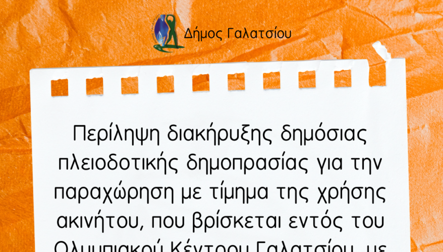 Περίληψη Διακήρυξης δημόσιας πλειοδοτικής δημοπρασίας για την παραχώρηση με τίμημα της χρήσης ακινήτου, που βρίσκεται εντός του Ολυμπιακού Κέντρου Γαλατσίου, στην Λεωφόρο Βεΐκου 137, με σκοπό τη δημιουργία Αθλητικών Εγκαταστάσεων
