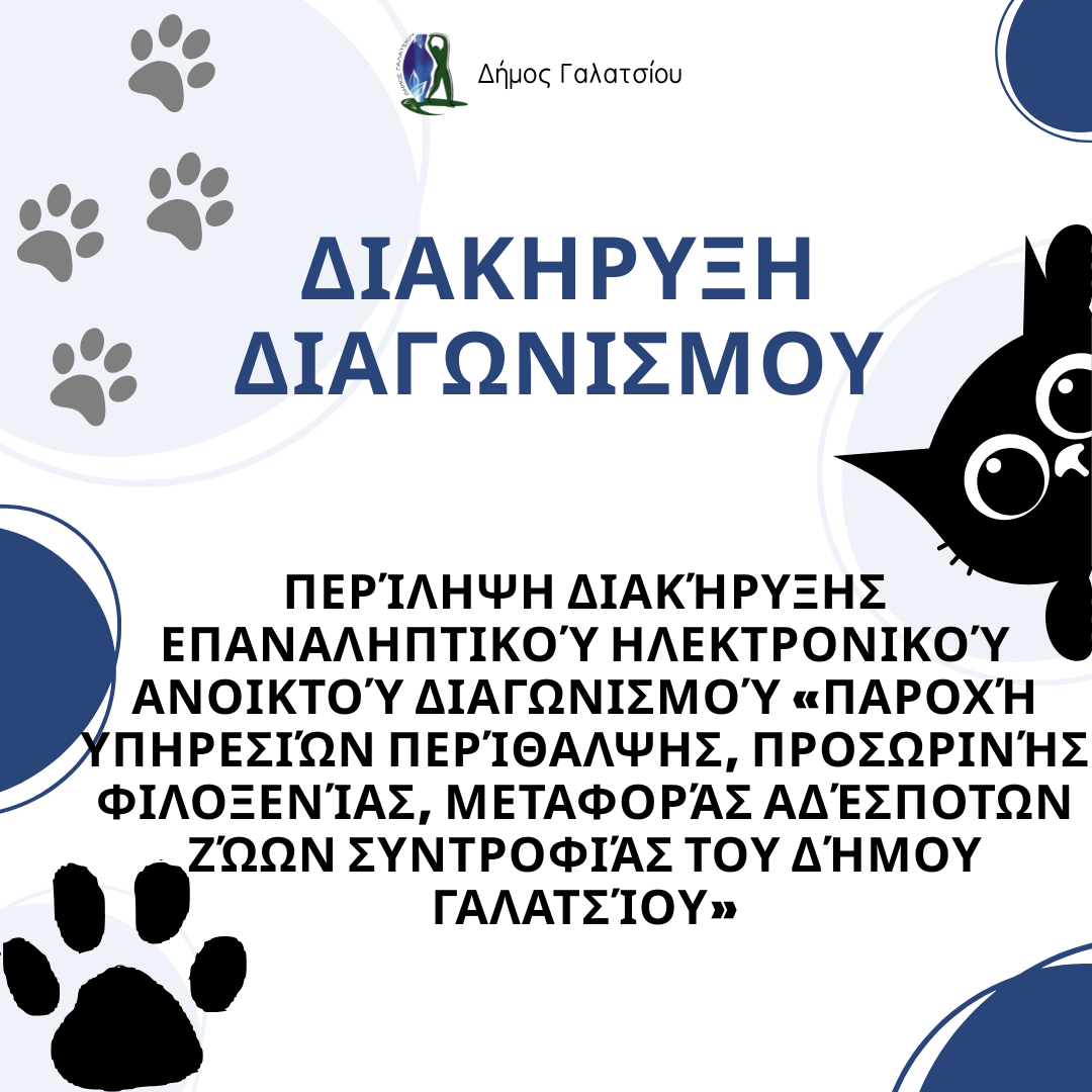 Περίληψη Διακήρυξης Επαναληπτικού Ηλεκτρονικού Ανοικτού Διαγωνισμού « ΠΑΡΟΧΗ ΥΠΗΡΕΣΙΩΝ ΠΕΡΙΘΑΛΨΗΣ ,ΠΡΟΣΩΡΙΝΗΣ ΦΙΛΟΞΕΝΙΑΣ, ΜΕΤΑΦΟΡΑΣ ΑΔΕΣΠΟΤΩΝ ΖΩΩΝ ΣΥΝΤΡΟΦΙΑΣ ΤΟΥ ΔΗΜΟΥ ΓΑΛΑΤΣΙΟΥ» για τις ομάδες Α΄ και Γ΄ ΣΥΝΟΛΙΚΟΥ ΕΝΔΕΙΚΤΙΚΟΥ ΠΡΟΥΠΟΛΟΓΙΣΜΟΥ 26.412,00 €
