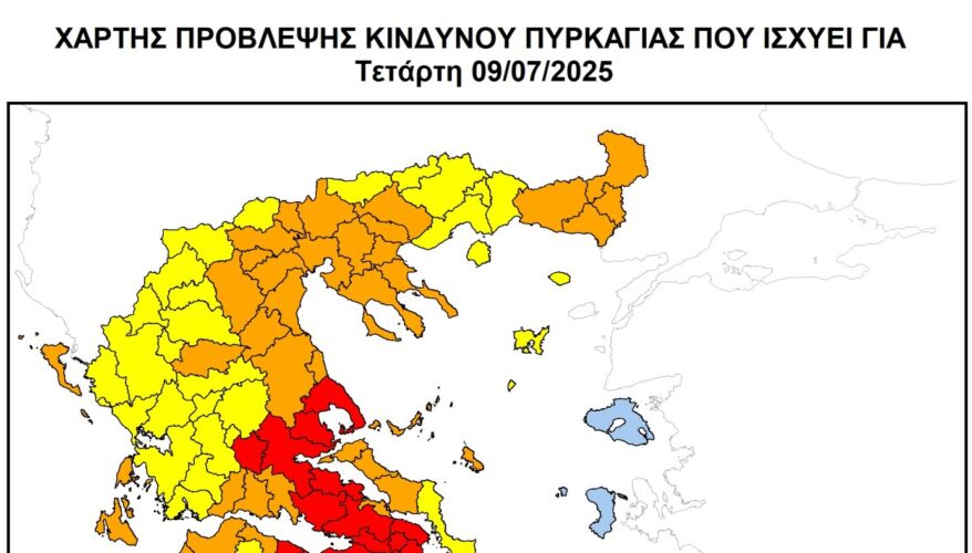 Πολύ υψηλός κίνδυνος πυρκαγιάς – κατάσταση συναγερμού (κατηγορία 5) προβλέπεται για αύριο Τετάρτη 9 Ιουλίου 2025 στην Αττική, σύμφωνα με τον Χάρτη Πρόβλεψης Κινδύνου Πυρκαγιάς που εκδίδει η Γενική Γραμματεία Πολιτικής Προστασίας του Υπουργείου Κλιματικής Κρίσης & Πολιτικής Προστασίας (civilprotection.gov.gr).