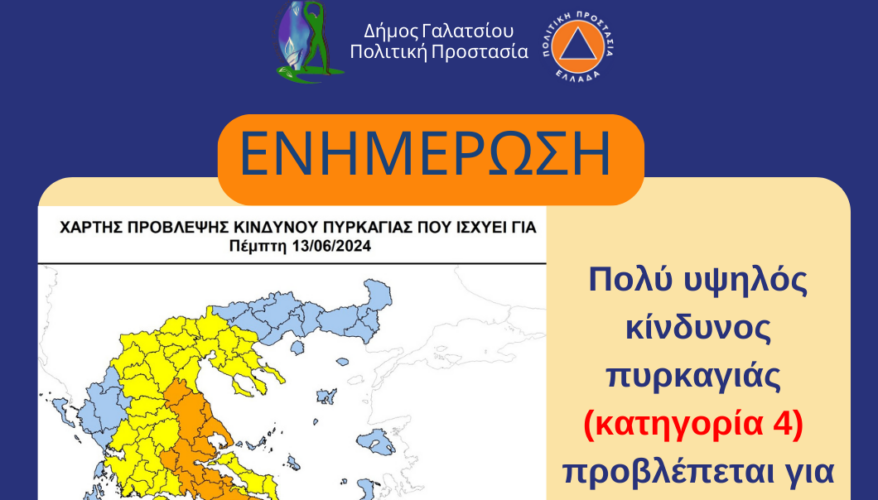 Το Γραφείο Πολιτικής Προστασίας Δήμου Γαλατσίου σας ενημερώνει ότι, σύμφωνα με το Χάρτη Πρόβλεψης Κινδύνου Πυρκαγιάς που εκδίδει η Γενική Γραμματεία Πολιτικής Προστασίας του Υπουργείου Κλιματικής Κρίσης & Πολιτικής Προστασίας (civilprotection.gov.gr ), λόγω του πολύ υψηλού κινδύνου πυρκαγιάς (κατηγορία 4) που προβλέπεται για αύριο Πέμπτη 13 Ιουνίου 2024, απαγορεύεται στους πολίτες να εισέρχονται στις δασικές εκτάσεις Δήμου Γαλατσίου που αναφέρονται στην απόφαση του Περιφερειάρχη Αττικής (ΑΔΑ:Ρ7707Λ7-235), ώστε να μειωθεί ο κίνδυνος εμφάνισης πυρκαγιάς.