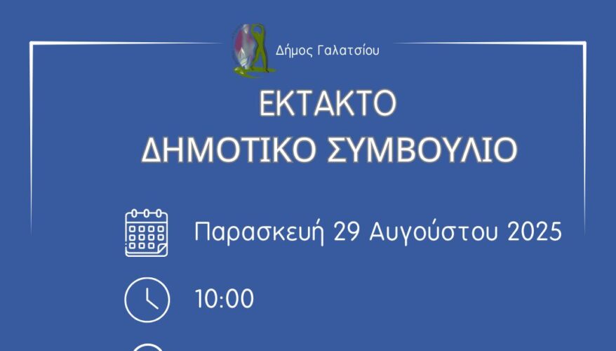 Σύμφωνα με τις διατάξεις του άρθρου 67 του Ν. 3852/2010, όπως αυτό αντικαταστάθηκε και ισχύει από το άρθρο 6 του Ν. 5056/2023, σας καλούμε για Έκτακτη Συνεδρίαση του Δημοτικού Συμβουλίου που θα πραγματοποιηθεί με τη διαδικασία της «δια περιφοράς» (e–mail, τηλέφωνο και μέσω μηνύματος), την 29η Αυγούστου 2025, ημέρα Παρασκευή και ώρα 10:00 έως 11:00, για την κατεπείγουσα λήψη απόφασης ενόψει της έναρξης λειτουγίας των Παραρτημάτων Νηπιαγωγείων από 01.09.2025, που αναφέρεται στο μοναδικό θέμα της Ημερήσιας Διάταξης.