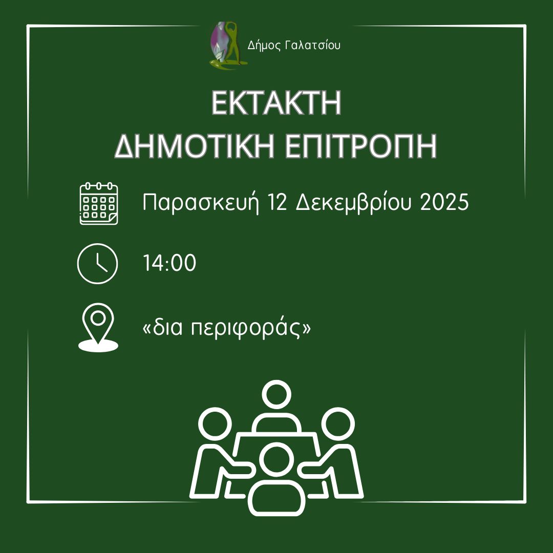 Έχοντας υπόψη τις διατάξεις του άρθρου 75 του Ν. 3852/2010 (ΚΑΛΛΙΚΡΑΤΗΣ) όπως αυτός αντικαταστάθηκε και ισχύει με τα άρθρα 8 και 9 του Ν. 5056/2023, σας καλούμε στην Έκτακτη Συνεδρίαση της Δημοτικής Επιτροπής που θα πραγματοποιηθεί την 12η Δεκεμβρίου 2025, ημέρα Παρασκευή και ώρα 14:00 για την κατεπείγουσα λήψη αποφάσεων για: α) δικαστική υπόθεση του Δήμου και β) λόγω καταληκτικής ημερομηνίας έναρξης του Χριστουγεννιάτικου Φεστιβάλ 2025, που αναφέρεται στα θέματα της Ημερήσιας Διάταξης.