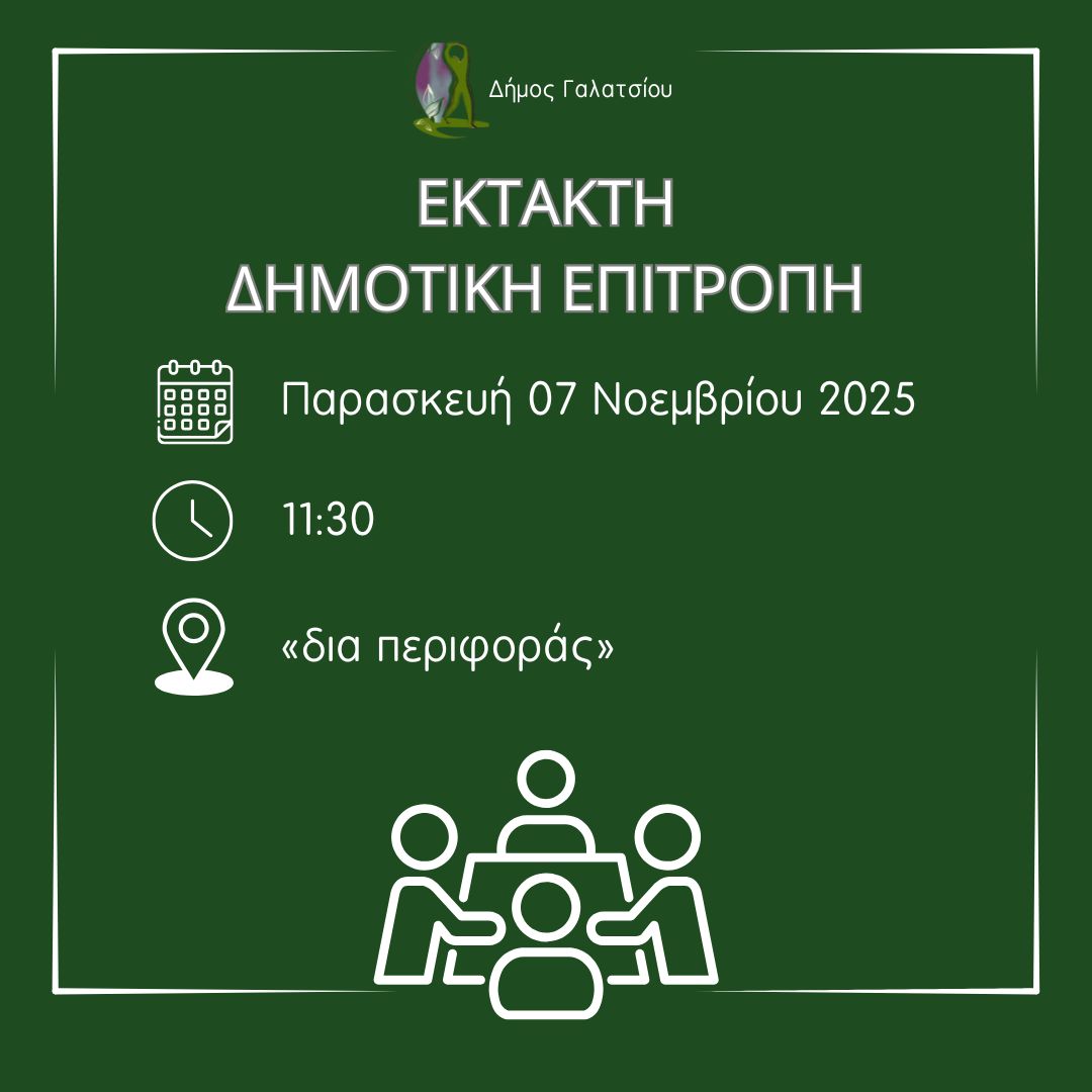 Έχοντας υπόψη τις διατάξεις του άρθρου 75 του Ν. 3852/2010 (ΚΑΛΛΙΚΡΑΤΗΣ) όπως αυτός αντικαταστάθηκε και ισχύει με τα άρθρα 8 και 9 του Ν. 5056/2023, σας καλούμε στην Έκτακτη Συνεδρίαση της Δημοτικής Επιτροπής που θα πραγματοποιηθεί την 07η Νοεμβρίου 2025, ημέρα Παρασκευή και ώρα 11:30 για την κατεπείγουσα λήψη αποφάσεων, λόγω λήξης των συμβάσεων (έως 31.12.2025) προμήθειας τροφίμων Παιδικών Σταθμών & ΚΑΠΗ που αναφέρονται στα παρακάτω θέματα της Ημερήσιας Διάταξης.