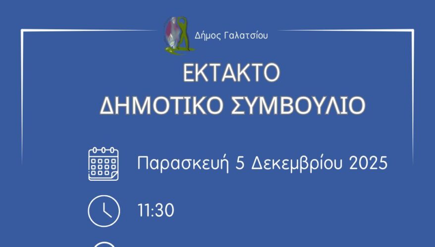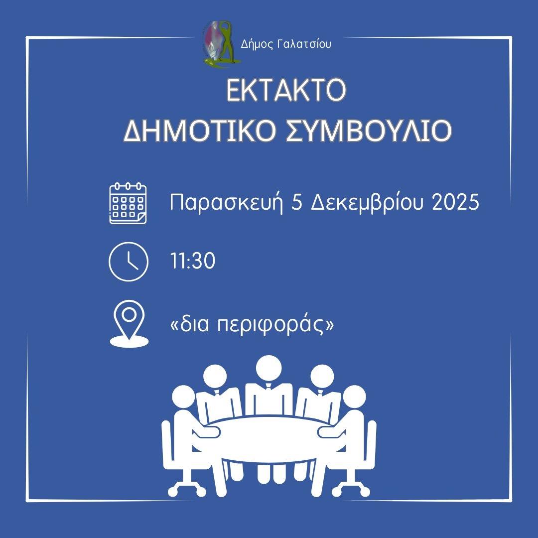 Σύμφωνα με τις διατάξεις του άρθρου 67 του Ν. 3852/2010, όπως αυτό αντικαταστάθηκε και ισχύει από το άρθρο 6 του Ν. 5056/2023, σας καλούμε για Έκτακτη Συνεδρίαση του Δημοτικού Συμβουλίου που θα πραγματοποιηθεί με τη διαδικασία της «δια περιφοράς» (e–mail, τηλέφωνο και μέσω μηνύματος), την 05η Δεκεμβρίου 2025, ημέρα Παρασκευή και ώρα 11:30 έως 12:30, για την κατεπείγουσα λήψη απόφασης για την έγκριση οικονομικών ενισχύσεων 3ης δόσης ενόψει των Χριστουγέννων, που αναφέρεται στο μοναδικό θέμα της Ημερήσιας Διάταξης.