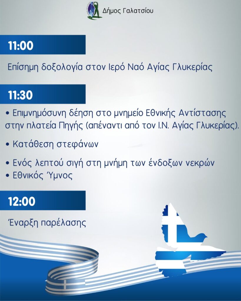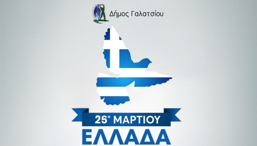 Ο Δήμαρχος Γαλατσίου Γεώργιος Μαρκόπουλος και τα μέλη του Δημοτικού Συμβουλίου, με την ευκαιρία του εορτασμού της Εθνικής επετείου της 25ης Mαρτίου, σας προσκαλούν να τιμήσετε με την παρουσία σας τις προγραμματισμένες εκδηλώσεις.