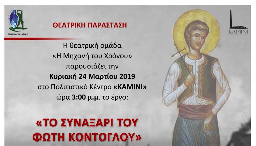 Θεατρική παράσταση: «Το συναξάρι του Φώτη Κόντογλου» από τη θεατρική ομάδα «Η μηχανή του χρόνου», η οποία αποτελείται από πενήντα (50) νέους και νέες, μαθητές και φοιτητές.