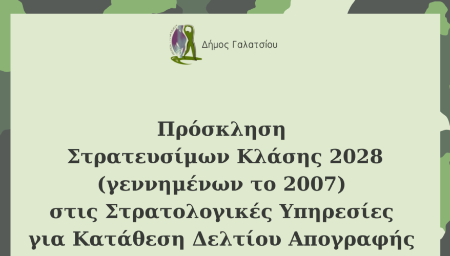 Οι στρατεύσιμοι που γεννήθηκαν το έτος 2007 Κλάσεως 2028 εγγεγραμμένοι στα Μητρώα Αρρένων του Δήμου μας υποχρεούνται σύμφωνα με το Φ.430/88/315930/Σ.8900/4-11-2024 έγγραφο του Στρατολογικού Γραφείου να παρουσιαστούν σε αυτό και συγκεκριμένα στο Στρατολογικό Γραφείο Αττικής Τμήμα 2ο , οδός Πέτρου Ράλλη 2, περιοχή Ρούφ ή στα ΚΕΠ του Δήμου μας και οποιοδήποτε ΚΕΠ της χώρας, για τους διαμένοντες στο εξωτερικό στις αρμόδιες προξενικές αρχές, καθώς και ηλεκτρονικά μέσω ιστοσελίδας του Νομικού Σώματος www.stratologia.gr από το μενού “Υποβολή Αιτημάτων/Κατάθεση Δελτίου Απογραφής” με χρήση κωδικών taxisnet, να καταθέσουν δελτίο απογραφής τις παρακάτω τακτές ημερομηνίες