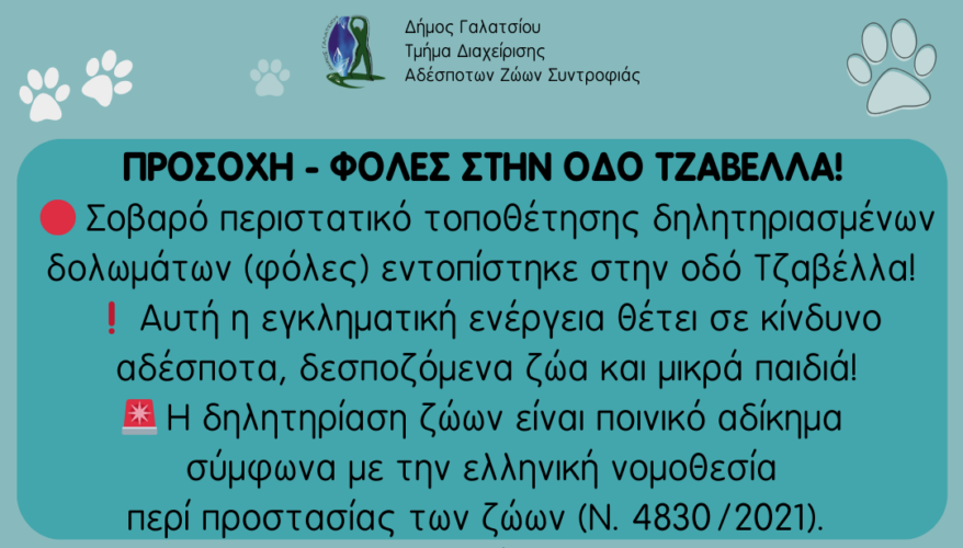 Προσοχή! Σοβαρό περιστατικό τοποθέτησης δηλητηριασμένων δολωμάτων (φόλες) εντοπίστηκε στην οδό Τζαβέλλα.