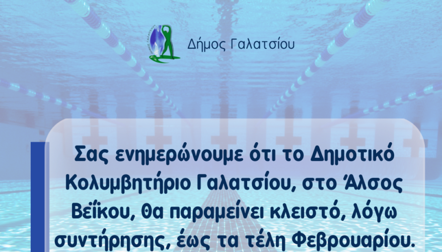 Σας ενημερώνουμε ότι το Δημοτικό Κολυμβητήριο Γαλατσίου, στο Άλσος Βεΐκου, θα παραμείνει κλειστό, λόγω συντήρησης, έως τα τέλη Φεβρουαρίου.