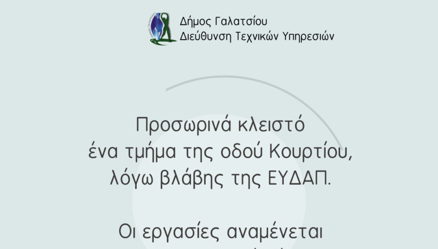 Σας ενημερώνουμε ότι ένα τμήμα της οδού Κουρτίου έχει κλείσει προσωρινά, λόγω εργασιών της ΕΥΔΑΠ.