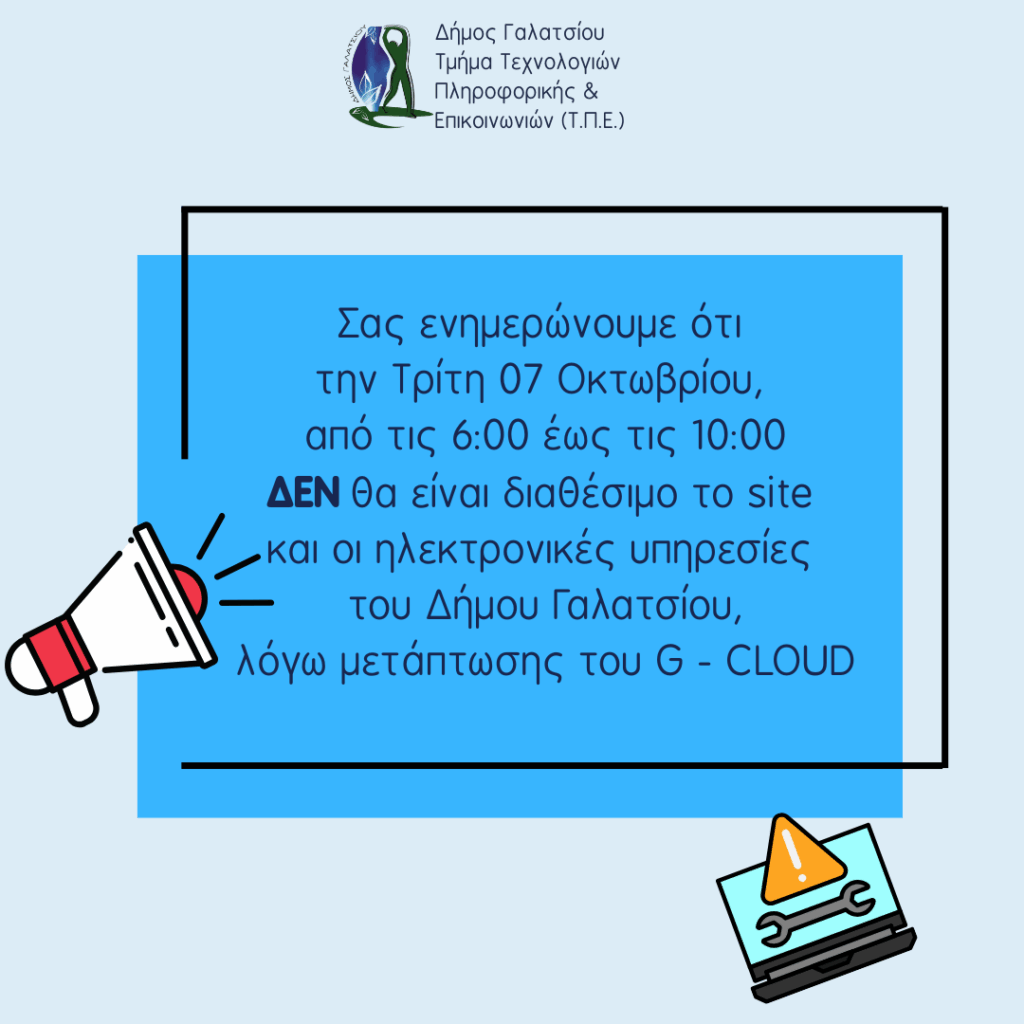 Σας ενημερώνουμε ότι την Τρίτη 7 Οκτωβρίου, από τις 06:00 έως τις 10:00, δεν θα είναι διαθέσιμο το site και οι ηλεκτρονικές υπηρεσίες του Δήμου Γαλατσίου, λόγω μετάπτωσης στο G-CLOUD.
