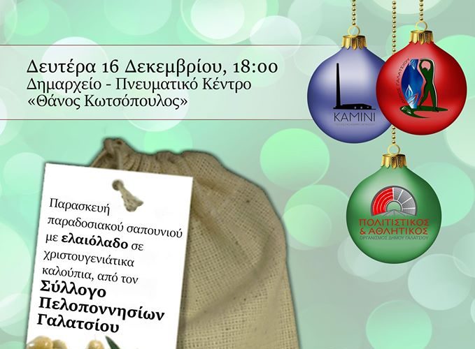 – Παρασκευή σαπουνιού, με τον Σύλλογο Πελοποννησίων, στις 18:00
