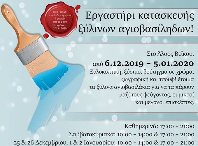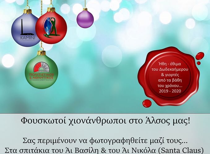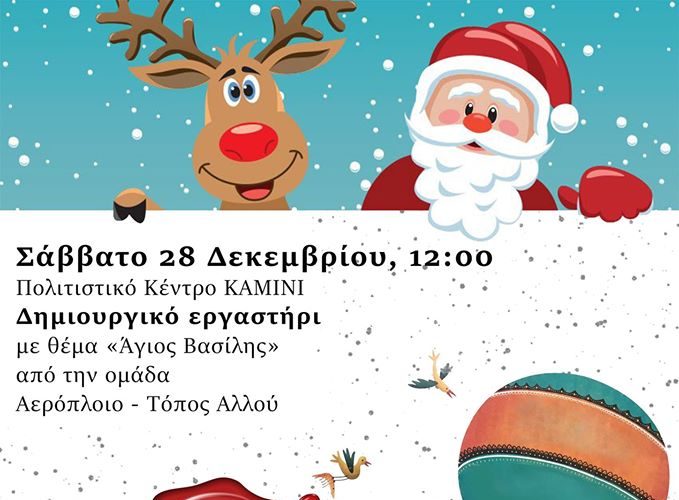 Εργαστήρια, ξωτικά, magic show, παραστάσεις, τρενάκι, σπιτάκια Άι Βασίλη – Άι Νικόλα (Santa Claus) στο Άλσος, μοναδικές εκθέσεις στο Καμίνι και στο Πνευματικό Κέντρο, κεράσματα, κάστανα, popcorn… Συντονιστείτε!