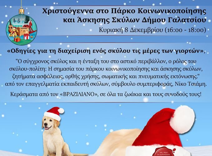 Σε λίγη ώρα, σήμερα Κυριακή 8.12.2019, 16:00 – 18:00, στο Πάρκο Κοινωνικοποίησης και Άσκησης Σκύλων του Δήμου μας!