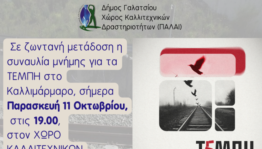 Ο Δήμος Γαλατσίου διοργανώνει ανοιχτή προβολή, με live μετάδοση, της συναυλίας για τα ΤΕΜΠΗ, σήμερα Παρασκευή 11 Οκτωβρίου, στις 19:00, στον χώρο Καλλιτεχνικών Δραστηριοτήτων (Ολυμπιακό Γυμναστήριο Γαλατσίου- ΠΑΛΑΙ).