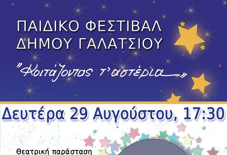 Σήμερα Δευτέρα 29 Αυγούστου, διασκεδάζουμε τους μικρούς μας φίλους με τρεις μοναδικές θεατρικές παραστάσεις, στο ανοιχτό Γήπεδο Μπάσκετ Άλσους Βεΐκου (είσοδος Β’), στο πλαίσιο του Παιδικού Φεστιβάλ Γαλατσίου.