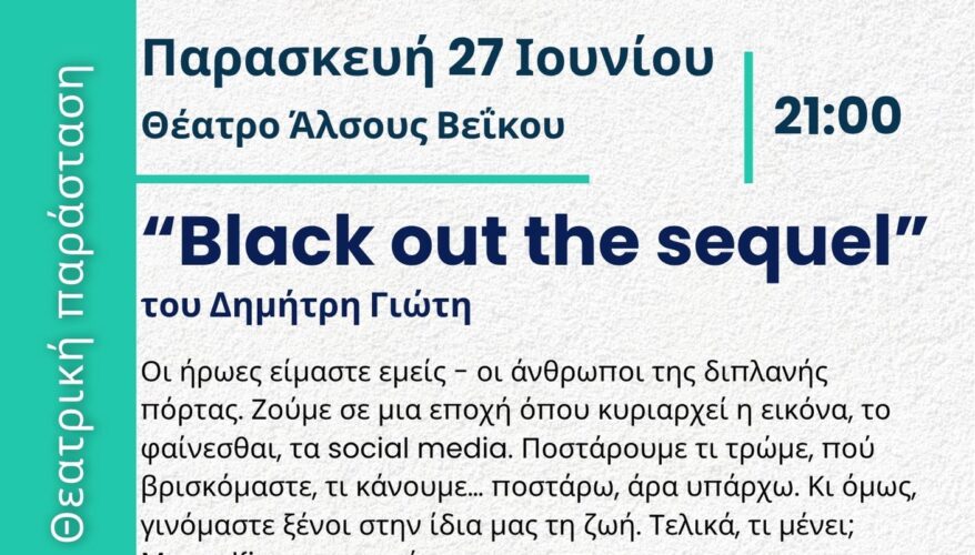 Σήμερα Παρασκευή 27 Ιουνίου 2025, η θεατρική παράσταση «Black out the sequel» του Δημήτρη Γιώτη, στο Ανοιχτό Θέατρο Άλσους Βεΐκου, στις 21:00, στο πλαίσιο του Θερινού Φεστιβάλ Γαλατσίου 2025.