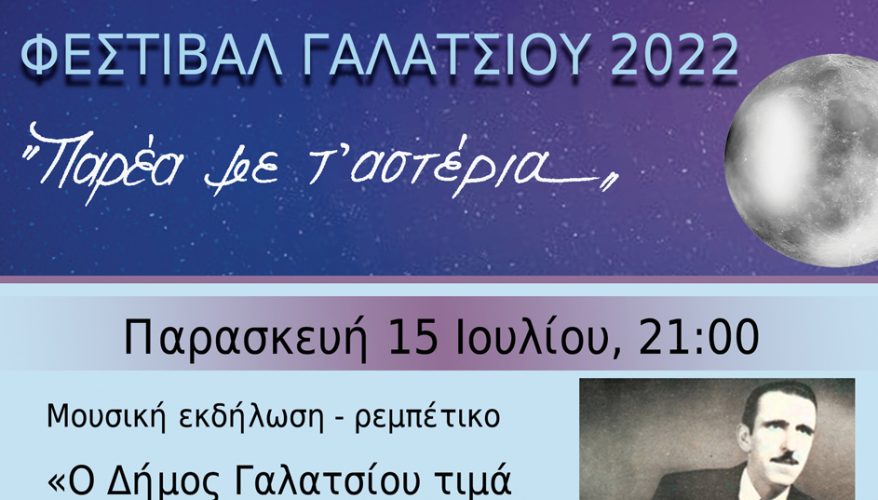 Σήμερα Παρασκευή 15 Ιουλίου μουσική εκδήλωση – ρεμπέτικο «Ο Δήμος Γαλατσίου τιμά τον συνθέτη και στιχουργό Γιάννη Παπαϊωάννου», στις 21:00, στο Ανοιχτό Θέατρο Άλσους Βεΐκου, με ΕΛΕΥΘΕΡΗ ΕΙΣΟΔΟ!