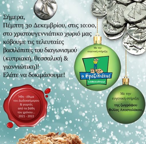 Σήμερα, Πέμπτη 30 Δεκεμβρίου, στις 10:00, στο χριστουγεννιάτικο χωριό μας κόβουμε τις τελευταίες βασιλόπιτες του διαγωνισμού μας (κυπριακή, θεσσαλική & γιαννιώτικη)!