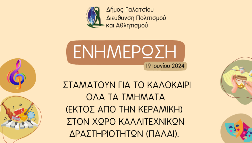 Σταματούν τα μαθήματα σε όλα τα τμήματα (εκτός από την ΚΕΡΑΜΙΚΗ) στον χώρο καλλιτεχνικών δραστηριοτήτων (ΠΑΛΑΙ) για το καλοκαίρι.