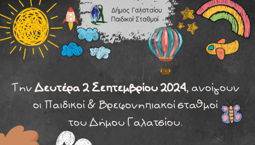 Αγαπητοί γονείς, σας ενημερώνουμε ότι την Δευτέρα 2 Σεπτεμβρίου 2024, ανοίγουν οι Παιδικοί και Βρεφονηπιακοί σταθμοί του Δήμου Γαλατσίου. 🙌