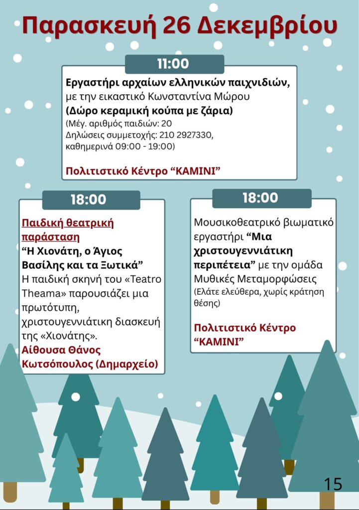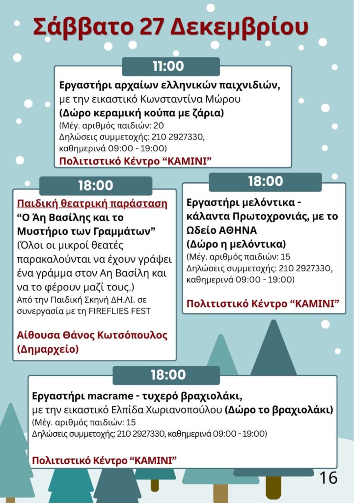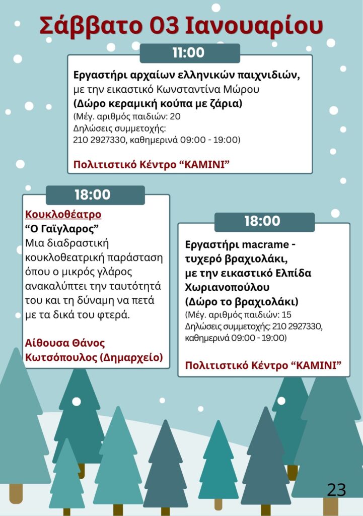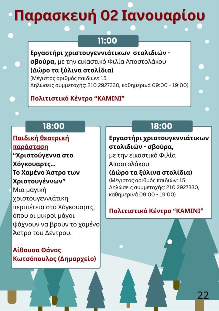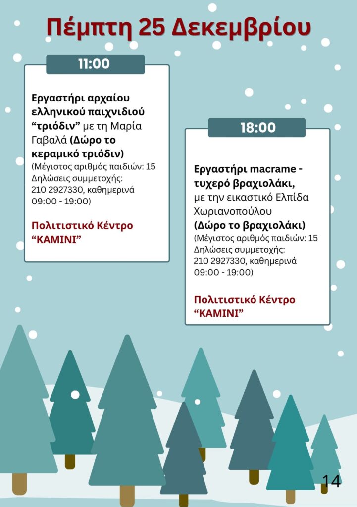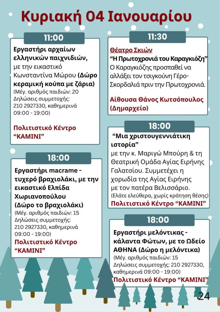 Οι χριστουγεννιάτικες εκδηλώσεις συνεχίζονται στο Άλσος Βεΐκου, στο Δημαρχείο Γαλατσίου, στο Πολιτιστικό Κέντρο ΚΑΜΙΝΙ, καθώς και στο παγοδρόμιο στο ΠΑΛΑΙ, με πλούσιο πρόγραμμα για μικρούς και μεγάλους.