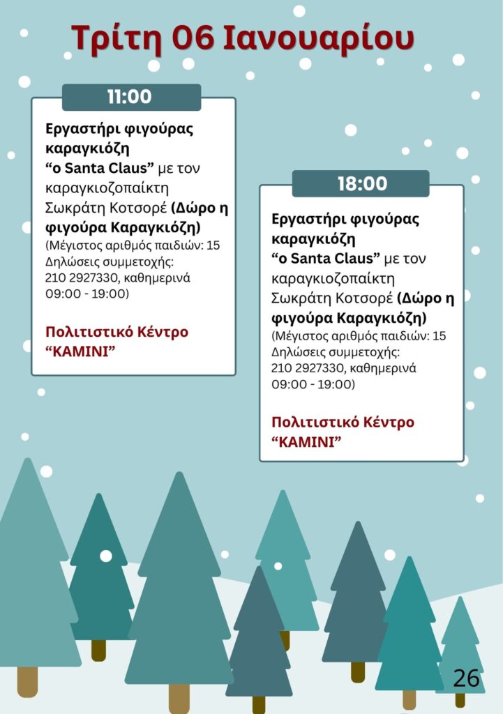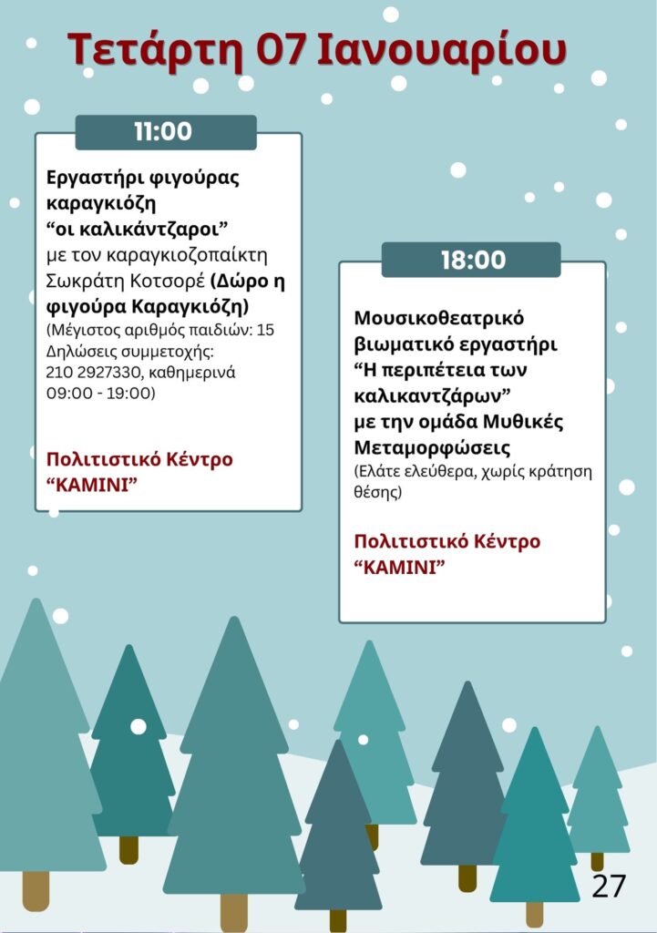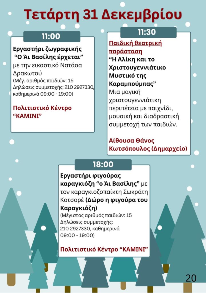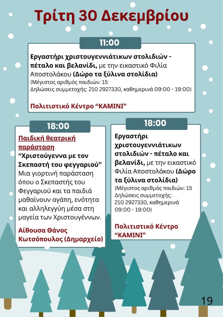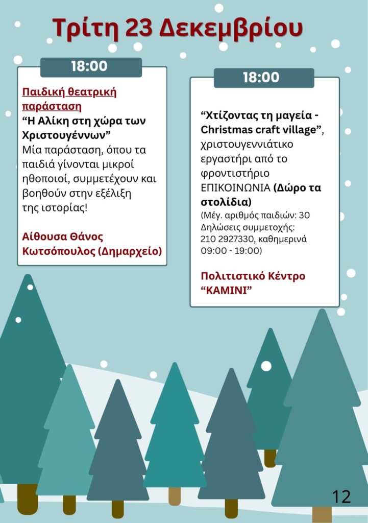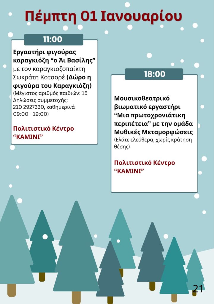Οι χριστουγεννιάτικες εκδηλώσεις συνεχίζονται στο Άλσος Βεΐκου, στο Δημαρχείο Γαλατσίου, στο Πολιτιστικό Κέντρο ΚΑΜΙΝΙ, καθώς και στο παγοδρόμιο στο ΠΑΛΑΙ, με πλούσιο πρόγραμμα για μικρούς και μεγάλους.