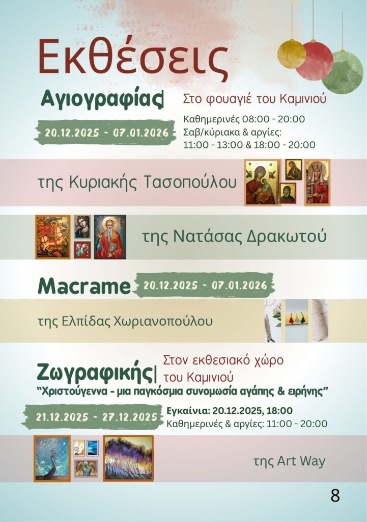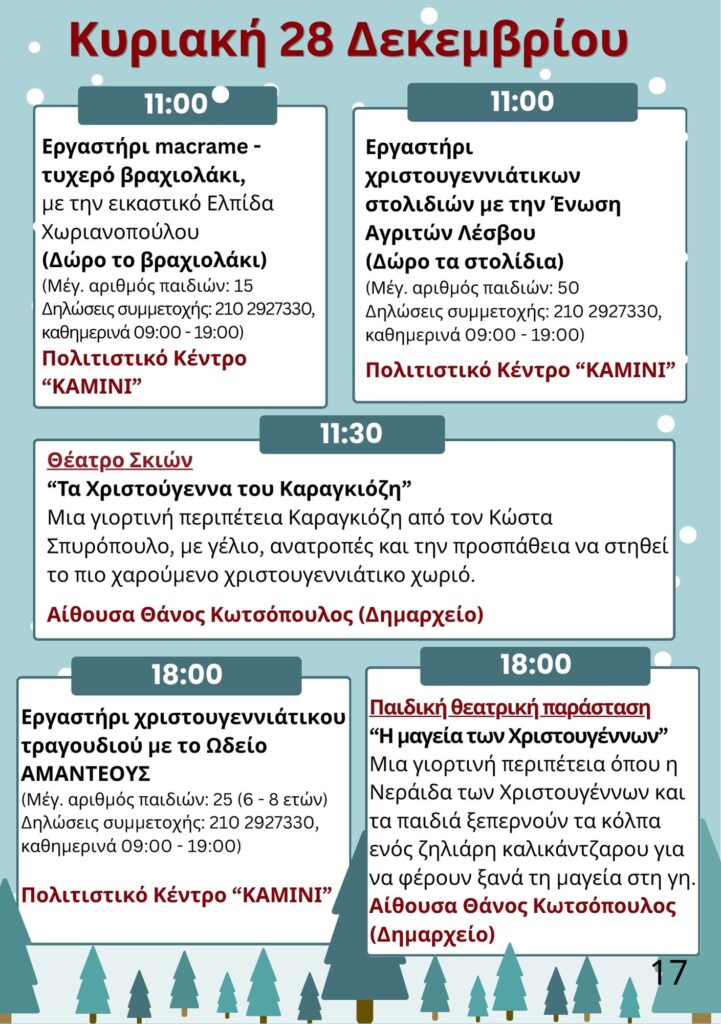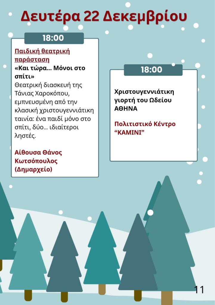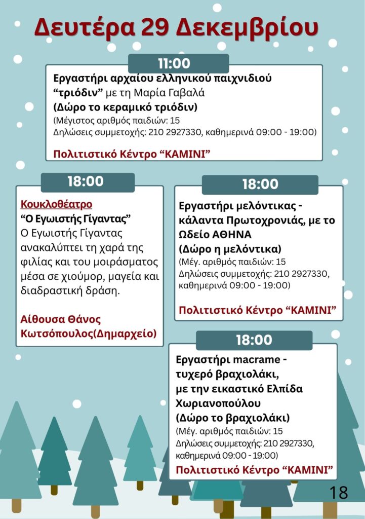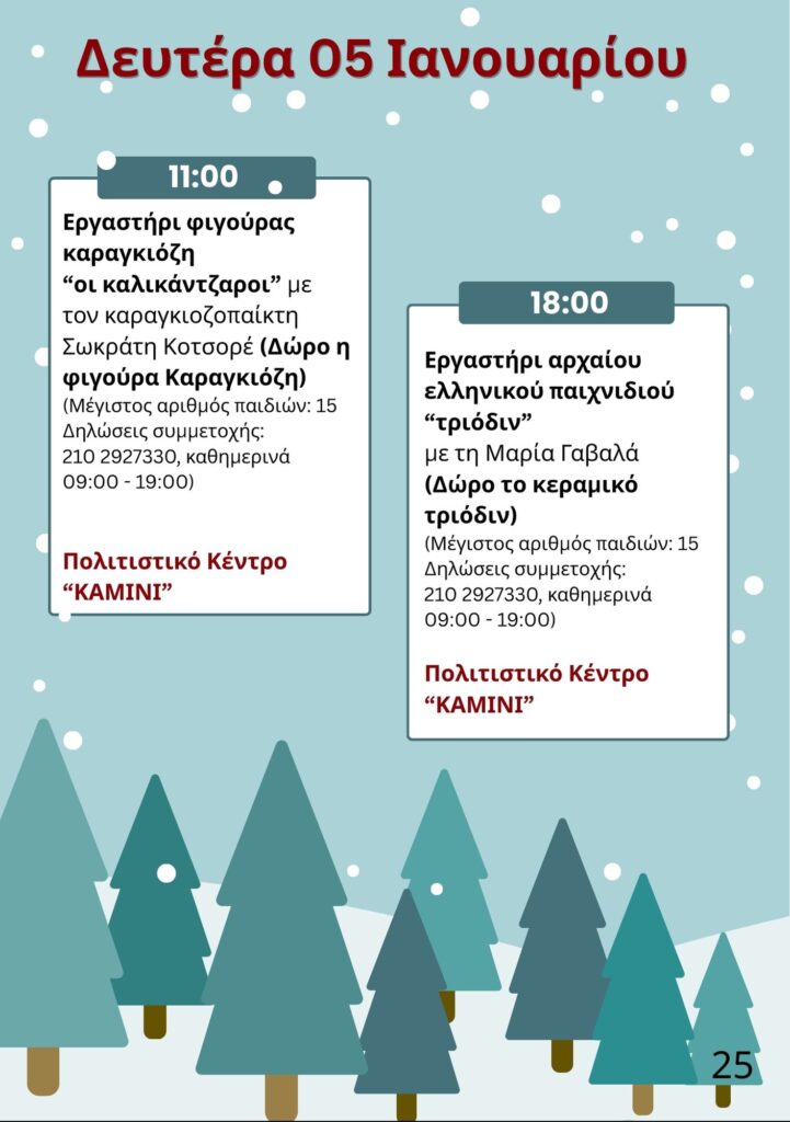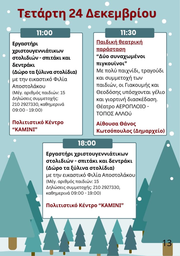 Οι χριστουγεννιάτικες εκδηλώσεις συνεχίζονται στο Άλσος Βεΐκου, στο Δημαρχείο Γαλατσίου, στο Πολιτιστικό Κέντρο ΚΑΜΙΝΙ, καθώς και στο παγοδρόμιο στο ΠΑΛΑΙ, με πλούσιο πρόγραμμα για μικρούς και μεγάλους.