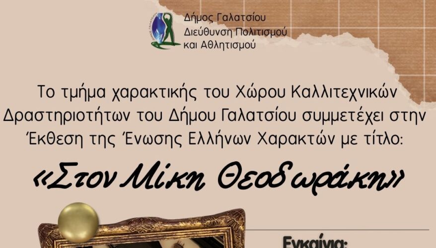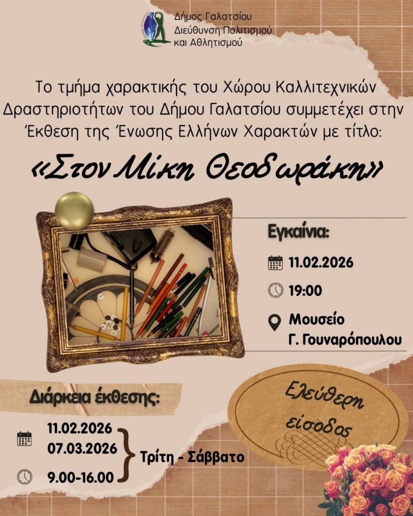 Το τμήμα χαρακτικής του Χώρου Καλλιτεχνικών Δραστηριοτήτων του Δήμου Γαλατσίου συμμετέχει στην έκθεση της Ένωσης Ελλήνων Χαρακτών με τίτλο «Στον Μίκη Θεοδωράκη», η οποία φιλοξενείται στο Μουσείο Γ. Γουναρόπουλου. Η έκθεση πραγματοποιήθηκε αρχικά, με την ευγενική χορηγία του Υπουργείου Πολιτισμού, τον Ιούλιο του 2025 στη Βασιλική του Αγίου Μάρκου στο Ηράκλειο της Κρήτης, στο πλαίσιο της ευρύτερης διοργάνωσης με τίτλο «100 χρόνια Μίκης Θεοδωράκης. Ο κρητικός οικουμενικός Έλληνας», και στη συνέχεια στον Φιλεκπαιδευτικό Σύλλογο «Αριστοτέλης» στη Φλώρινα.