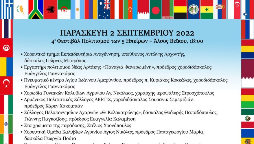 Συνεχίζεται και σήμερα Παρασκευή 2 Σεπτεμβρίου το 4ο Φεστιβάλ Πολιτισμού των 5 Ηπείρων στο Ανοιχτό Θέατρο Άλσους Βεΐκου, στις 18:00
