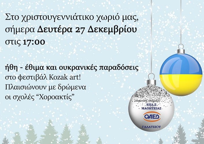 Αν και το προγραμματισμένο Ουκρανικό Φεστιβάλ δεν πραγματοποιήθηκε στο χριστουγεννιάτικο χωριό μας, λόγω των νέων μέτρων, τα μέλη της Ουκρανικής ομάδας επισκέφθηκαν χθες, 28 Δεκεμβρίου 2021 το Δημαρχείο μας, με τα μοναδικά μουσικά τους όργανα και τους εξαιρετικούς καλλιτέχνες τους και έψαλλαν τα χριστουγεννιάτικα παραδοσιακά κάλαντα ενώπιον του Γενικού Γραμματέα κ. Άγγελου Δημοσθένους και του Προέδρου του Πολιτιστικού και Αθλητικού Οργανισμού κ. Μάνου Ελευθερίου, οι οποίοι τους υποδέχθηκαν με θέρμη και αφού συνομίλησαν μαζί τους, τους ευχαρίστησαν για το εορταστικό κλίμα των ημερών που τους μετέφεραν, ανταλλάσσοντας ευχές και δώρα!