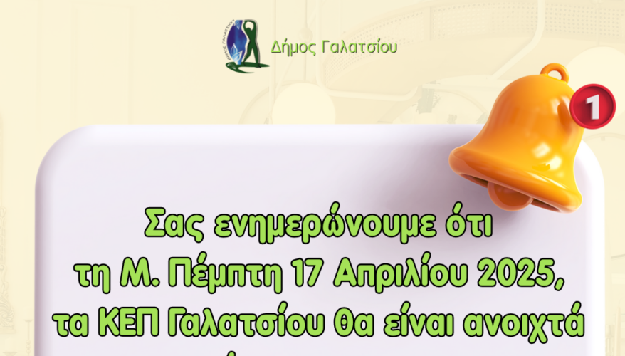 Τα ΚΕΠ Δήμου Γαλατσίου τη Μεγ. Πέμπτη 17 Απρίλιου 2025 θα είναι ανοιχτά έως τις 13:00