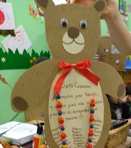 Τα παιδιά έστειλαν μαζί με την αγάπη τους δυο γλυκά λογάκια, στον Λουϊτζι, το μικρό αρκουδάκι, τα οποία έλεγαν τα εξής: «Εμείς λοιπόν εδώ, λατρεύουμε τα κάθε είδους ταξίδια! Τα … ΜΑΚΡΙΝΑ ΤΑΞΙΔΙΑ … σε νέους τόπους και προορισμούς! Τα … ΠΟΛΥΧΡΩΜΑ ΤΑΞΙΔΙΑ … της φαντασίας μας, που θα μας μεταφέρουν, σε μέρη μακρινά, πασπαλισμένα με τη χρυσόσκονη των παιδικών ονείρων μας! Μα πιο πολύ αγαπάμε τα … ΤΑΞΙΔΙΑ ΤΗΣ ΚΑΡΔΙΑΣ ΜΑΣ…!Εκείνα που μας κάνουν ΧΑΡΟΥΜΕΝΟΥΣ και ΕΥΤΥΧΙΣΜΕΝΟΥΣ και ζωγραφίζουν στα πρόσωπά μας, χαμόγελα γλυκά! Ένα τέτοιο ταξίδι κάναμε μαζί σου αγαπημένε μας Λουϊτζι! Ακόμα κι αν ποτέ δεν βρεθήκαμε από κοντά, πετάξαμε ωστόσο κοντά σου με τα φτερά της καρδιάς μας, σε γνωρίσαμε, σε λατρέψαμε και πάνω απ΄όλα σε κάναμε φίλο μας. Είσαι από εκείνους τους φίλους, που τους κρατάς καλά κλειδωμένους μέσα σου. Που δεν τους βλέπεις, αλλά ξέρεις ότι είναι πάντα εκεί! Σου στέλνουμε τα φιλιά μας, την αγάπη μας και μια τεράστια αγκαλιά! Και μην ξεχνάς… Μια μέρα χωρίς να συναντήσεις ένα φίλο, είναι σαν ένα βάζο που δεν έχει μέσα του ούτε μια σταγόνα μέλι! Σ΄ αγαπάμε πολύ!!!»