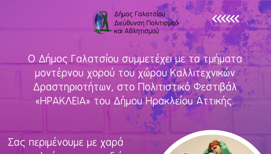 Ο Δήμος Γαλατσίου συμμετέχει με τα τμήματα μοντέρνου χορού του χώρου Καλλιτεχνικών Δραστηριοτήτων, στο Πολιτιστικό Φεστιβάλ «ΗΡΑΚΛΕΙΑ» του Δήμου Ηρακλείου Αττικής, την Κυριακή 22 Σεπτεμβρίου 2024, στις 20:00, στο κτημα ΦΙΞ (Πολιτιστικό πολυκέντρο Βίλα Στέλλα).