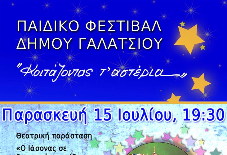 Θεατρική παράσταση  “Ο Ιάσονας σε θεατρικό παιχνίδι”, σήμερα Παρασκευή 15 Ιουλίου, στο ανοιχτό Γήπεδο Μπάσκετ Άλσους Βεΐκου (είσοδος Β’),  στις 19:30, στο πλαίσιο του Παιδικού Φεστιβάλ Δήμου Γαλατσίου «Κοιτάζοντας τ’ αστέρια».