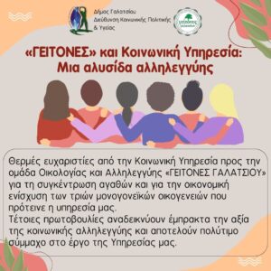 Η Κοινωνική Υπηρεσία του Δήμου μας εκφράζει τις θερμές της ευχαριστίες προς την ομάδα Οικολογίας και Αλληλεγγύης «ΓΕΙΤΟΝΕΣ ΓΑΛΑΤΣΙΟΥ» που με συνέπεια και ευαισθησία απευθύνεται κάθε χρόνο στην Υπηρεσία μας ζητώντας να προτείνουμε οικογένειες που βρίσκονται σε ανάγκη.