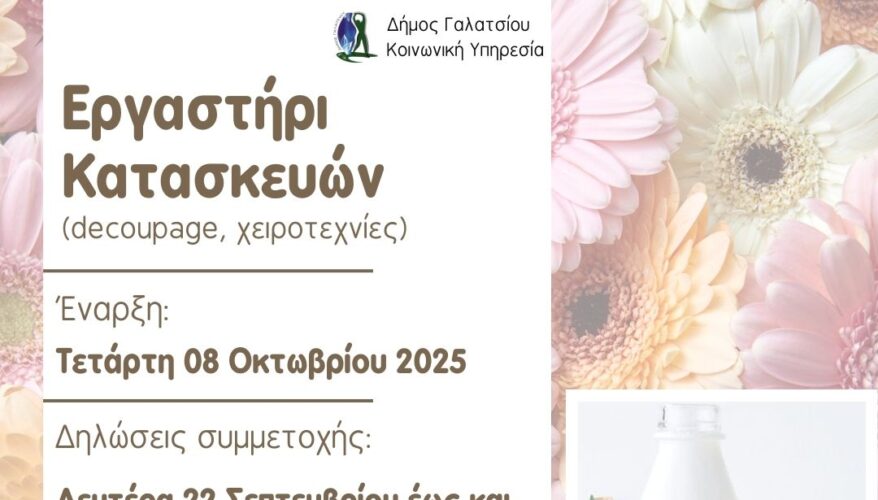 Η Κοινωνική Υπηρεσία του Δήμου μας δημιουργεί το «Εργαστήρι Κατασκευών (decoupage,χειροτεχνίες}», στο πλαίσιο των δράσεων Αλληλεγγύης και Εθελοντισμού. Στόχος είναι η μετάδοση γνώσεων, εμπειριών και τεχνικών βελτίωσης της καθημερινότητας και της ψυχαγωγίας.