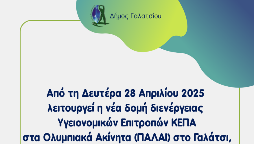 Από τη Δευτέρα 28 Απριλίου 2025 λειτουργεί η νέα δομή διενέργειας Υγειονομικών Επιτροπών ΚΕΠΑ στα Ολυμπιακά Ακίνητα (ΠΑΛΑΙ) στο Γαλάτσι, επί της Λεωφόρου Βεΐκου 139.