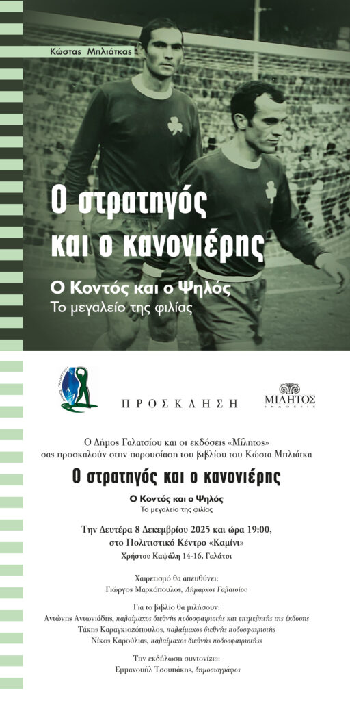 Ο Δήμος Γαλατσίου και οι εκδόσεις Μίλητος σας προσκαλούν στη παρουσίαση του νέου βιβλίου του Κώστα Μπλιάτκα, αφιερωμένου στη μοναδική φιλία και πορεία δύο θρύλων του ελληνικού ποδοσφαίρου — του Μίμη Δομάζου και του Αντώνη Αντωνιάδη.