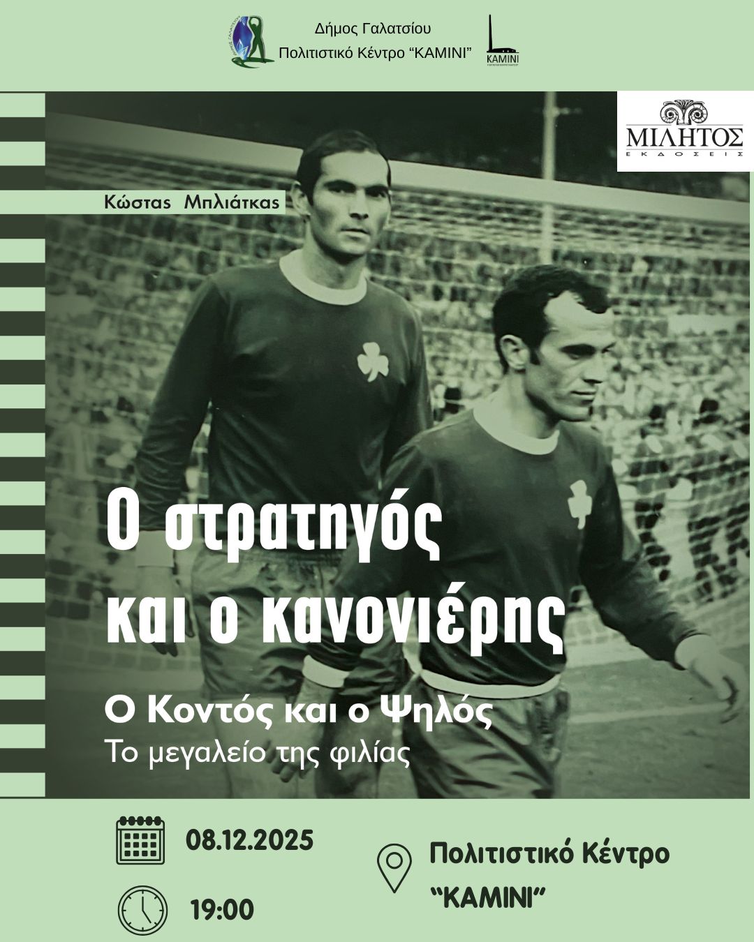 Ο Δήμος Γαλατσίου και οι εκδόσεις Μίλητος σας προσκαλούν στη παρουσίαση του νέου βιβλίου του Κώστα Μπλιάτκα, αφιερωμένου στη μοναδική φιλία και πορεία δύο θρύλων του ελληνικού ποδοσφαίρου — του Μίμη Δομάζου και του Αντώνη Αντωνιάδη.