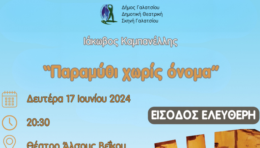Τη Δευτέρα 17 Ιουνίου, η θεατρική παράσταση «Παραμύθι χωρίς όνομα» ανεβαίνει στο Ανοιχτό Θέατρο Άλσους Βεΐκου, από τη Δημοτική Θεατρική Σκηνή Γαλατσίου