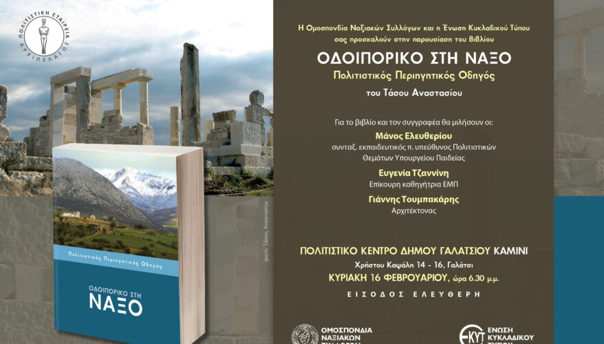 Την Κυριακή 16 Φεβρουαρίου 2025, στις 18:30, στο ΚΑΜΙΝΙ, παρουσίαση του βιβλίου «ΟΔΟΙΠΟΡΙΚΟ ΣΤΗ ΝΑΞΟ – Πολιτιστικός Περιηγητικός Οδηγός» του Τάσου Αναστασίου