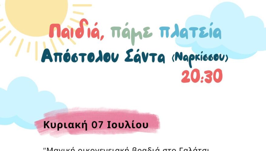 Την Κυριακή 07 Ιουλίου 2024 μαγική οικογενειακή βραδιά με κλόουν και ταχυδακτυλουργούς, στις 20:30, στην πλατεία Απόστολου Σάντα (Ναρκίσσου), στο πλαίσιο του Φεστιβάλ Γαλατσίου 2024 «Όμορφες Νύχτες στην πόλη».