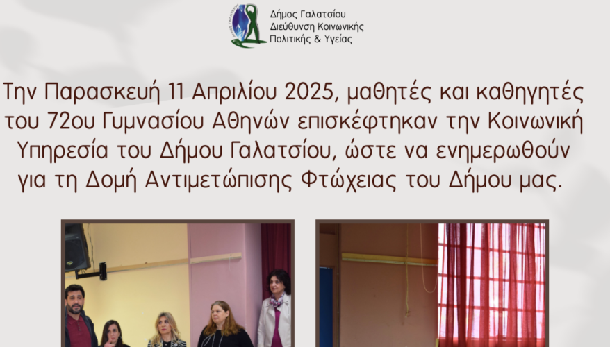 Με αίσθημα κοινωνικής ευθύνης και αλληλεγγύης, μαθητές και καθηγητές του 72ου Γυμνασίου Αθηνών, πραγματοποίησαν επίσκεψη στην Κοινωνική Υπηρεσία του Δήμου, την Παρασκευή 11 Απριλίου 2025, με στόχο την ενημέρωσή τους για τις δράσεις αντιμετώπισης της φτώχειας και την ενίσχυση των ωφελούμενων. Στο πλαίσιο αυτής της πρωτοβουλίας, οι μαθητές συνέλεξαν τρόφιμα και τα παρέδωσαν στο Κοινωνικό Παντοπωλείο, ενισχύοντας έμπρακτα την αλληλεγγύη και την κοινωνική συνοχή.